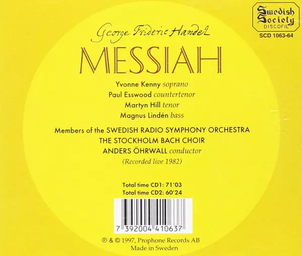 Georg Friedrich Händel: Messiah versie op 2CD in standaard editie. Deze specifieke uitgave werd uitgebracht in Zweden bij uitgeverij Swedish Society Discofil op 7. juli 1997. Album valt binnen het genre Klassieke muziek en Barokmuziek.