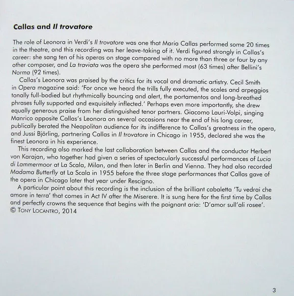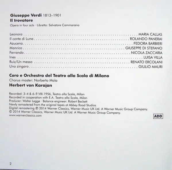 Maria Callas: Il Trovatore versie op 2CD in remastered editie. Deze specifieke uitgave werd uitgebracht in Europa bij uitgeverij Warner Classics op 22. september 2014. Album valt binnen het genre Klassieke muziek en Opera.