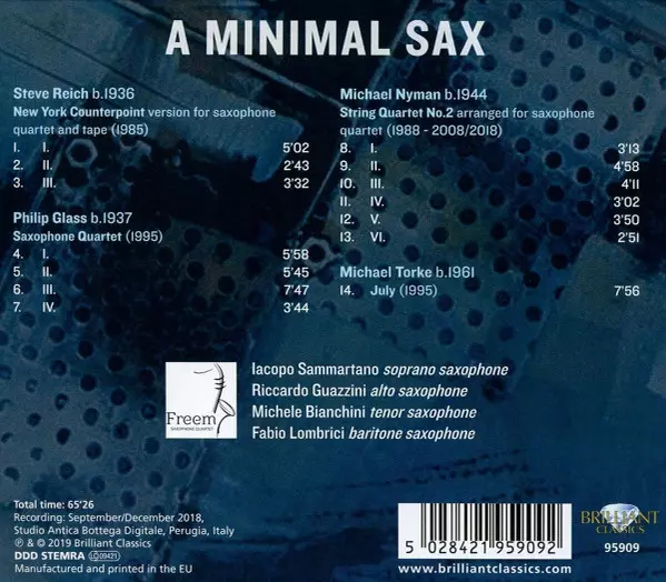 | Artiest | Philip Glass | Steve Reich | Michael Nyman | Michael Torke | Freem Saxophone Quartet |