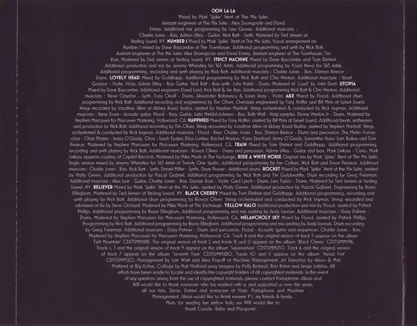 Acoustic Guitar, Sequenced By Flood | Bass Charlie Jones | Drums, Percussion Daisy Palmer | Mastered By Stephen Marcussen | Mixed By Flood | Mixed By [Assistant] Patrick Phillips | Programmed By Nick Batt | Programmed By [Additional Programming] Bruno Ellingham | Programmed By [Additional Programming], Mixed By [Assistant] Andy Savours | Recorded By [Drum Recording] Greg Freeman (2)