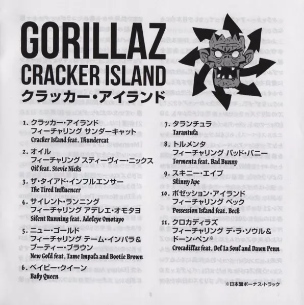 Gorillaz: Cracker Island versie op CD in standaard editie. Deze specifieke uitgave werd uitgebracht in Japan bij uitgeverij Parlophone in samenwerking met Warner Music Japan op 3. maart 2023. Album valt binnen het genre Synth-Pop, Neo-Psychedelia, Electropop, Synth Funk en Alternatieve dans.