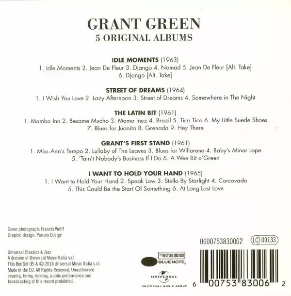 Grant Green: 5 Original Albums versie op 5CD/Doos in remastered editie. Deze specifieke uitgave werd uitgebracht in Europa bij uitgeverij Blue Note in samenwerking met Universal Music Group op 31. augustus 2018. Album valt binnen het genre Jazz en Hard Bop.