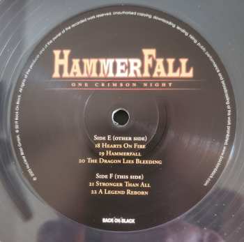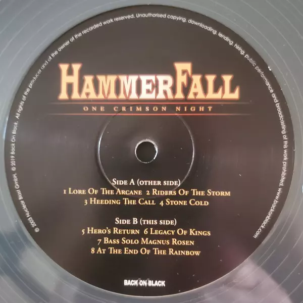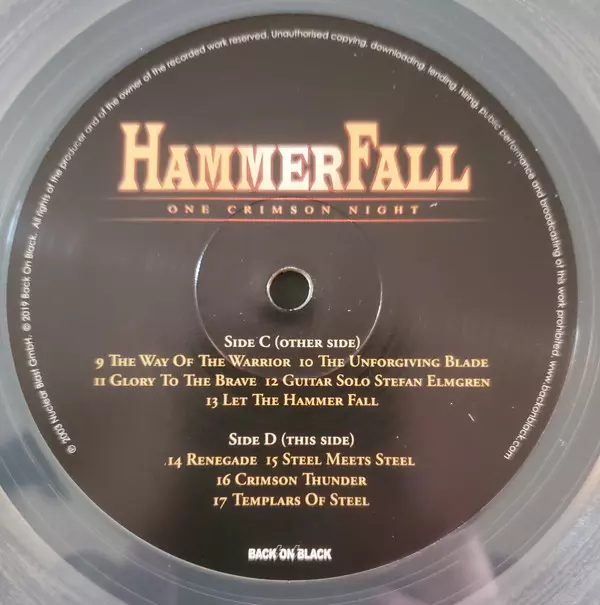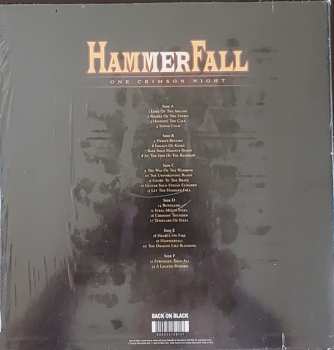 HammerFall "One Crimson Night" is an album released in 2003. It is a live album that was recorded at Lisebergshallen in Gothenburg, Sweden. The album contains a total of sixteen tracks, all of which are live versions of HammerFall songs. One Crimson Night is a great album for all HammerFall fans as it shows the band's ability in live performances.