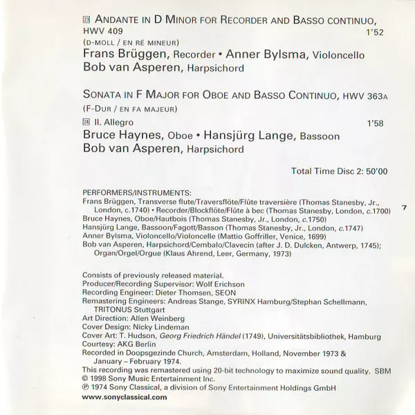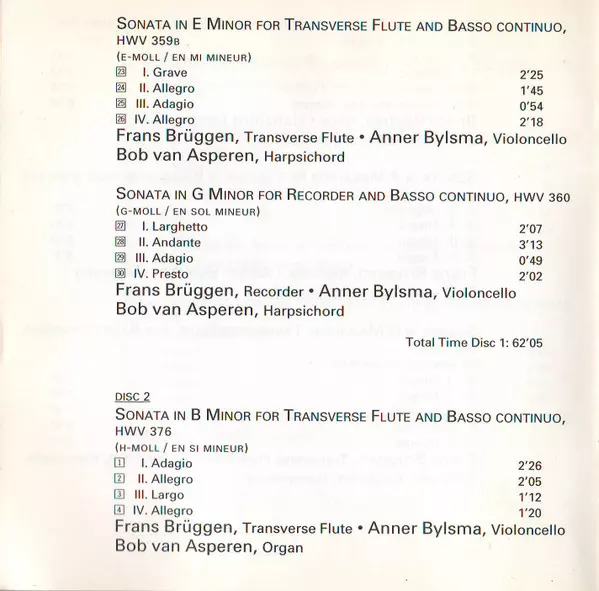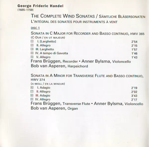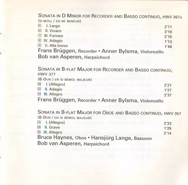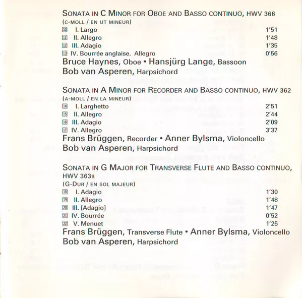 | Artiest | Georg Friedrich Händel | Anner Bylsma | Bob van Asperen | Frans Brüggen | Bruce Haynes | Hansjürg Lange |