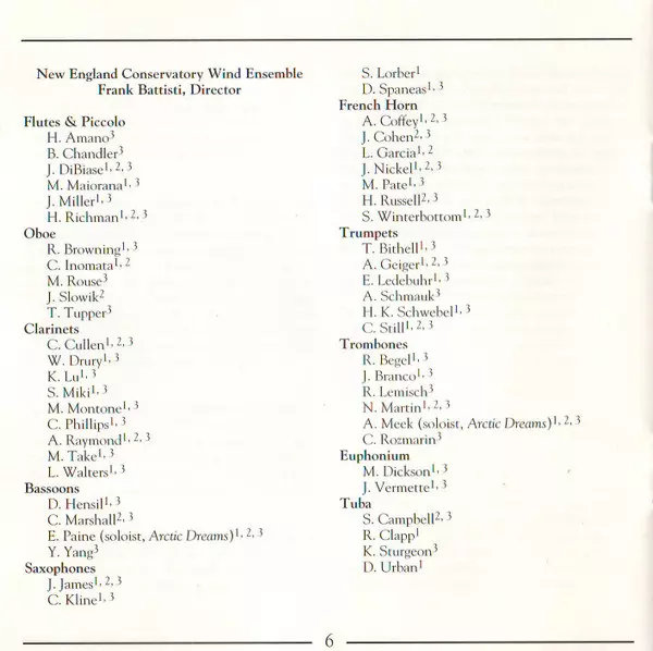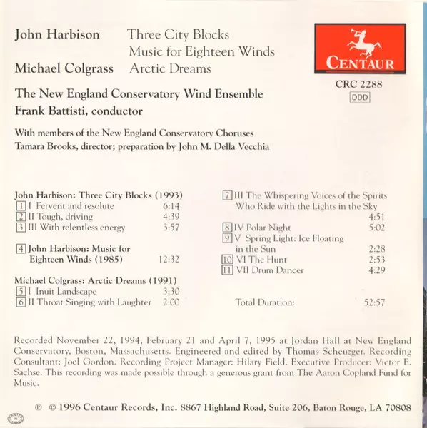 | Artiest | John Harbison | Michael Colgrass | New England Conservatory Wind Ensemble | Frank L. Battisti |