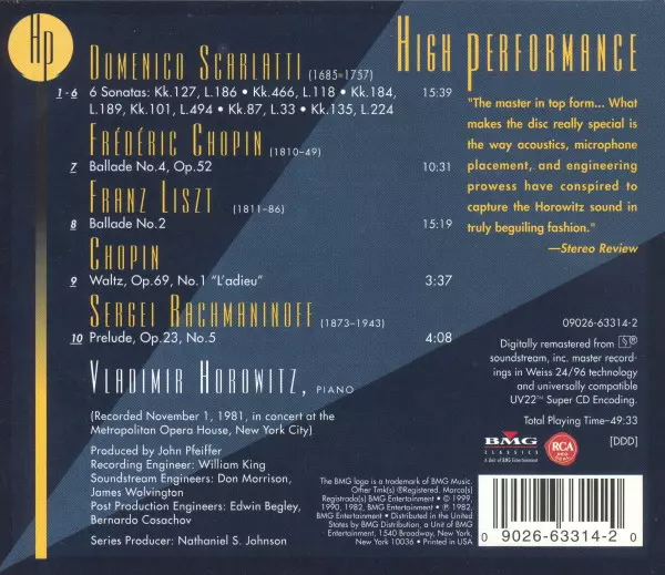 | Artiest | Frédéric Chopin | Franz Liszt | Vladimir Horowitz | Domenico Scarlatti | Sergei Rachmaninoff |