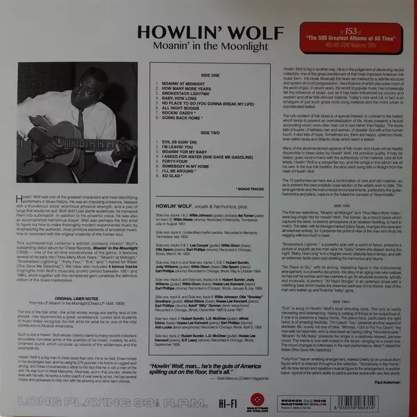 Howlin' Wolf Moanin' In The Moonlight is a seminal blues album from 1958. Howlin' Wolf The album is a collection of blues standards and features the distinctive raspy vocals and electric guitar. The album is cited as an influence by many rock and blues musicians and is considered a classic of the blues genre.