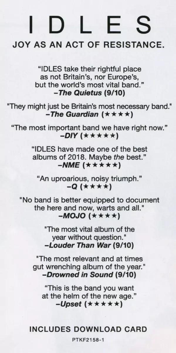 The Idles colossus is back. Just one year after their impressive debut album "Brutalism", the Bristol-based punk rock combo presents its successor. "Joy As An Act Of Resistance" is the title of the new album, a twelve-song, politically and socially criticalthrilling, exciting and loud work of art - just like its predecessor. ...