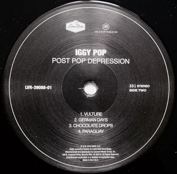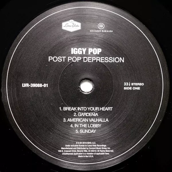 Iggy Pop: Post Pop Depression versie op vinyl LP in standaard editie. Deze specifieke uitgave werd uitgebracht in VS bij uitgeverij Loma Vista in samenwerking met Rekords Rekords op 18. maart 2016.