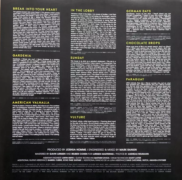 Bass, Acoustic Guitar [Nylon Acoustic], Piano, Keyboards [Funmachine], Vocals [Gang Vox] Josh Homme | Cello Richard Dodd (2) | Drums, Vocals [Gang Vox] Matt Helders | Twelve-String Guitar [12-String Electric], Vocals [Gang Vox] Dean Fertita | Viola Lauren Chipman | Violin Daphne Chen, Eric Gorfain | Vocals Iggy Pop