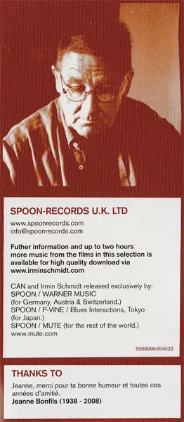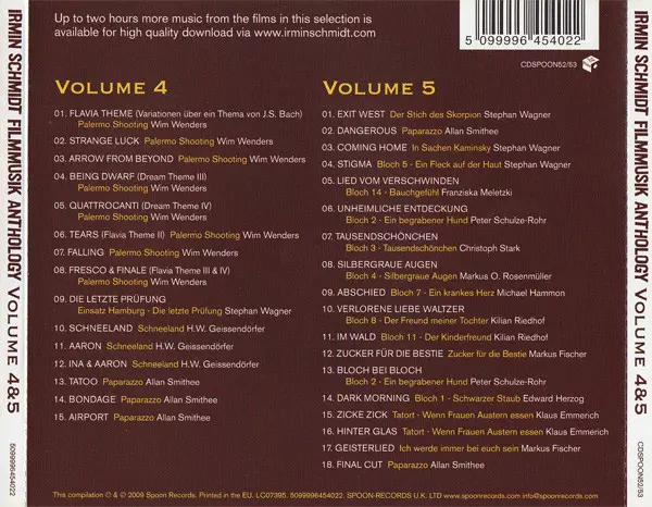 Irmin Schmidt: Filmmusik Anthology Volume 4 & 5 versie op 2CD in standaard editie. Deze specifieke uitgave werd uitgebracht in Verenigd Koninkrijk bij uitgeverij Spoon Records op 20. mei 2016. Album valt binnen het genre Stage & Screen en Soundtrack.