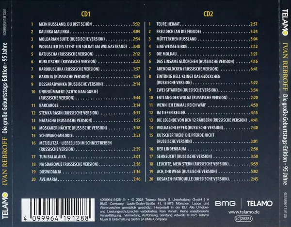 Ivan Rebroff: Die Große Geburtstag-Edition - 95 Jahre versie op 2CD in standaard editie. Deze specifieke uitgave werd uitgebracht in Duitsland bij uitgeverij TELAMO in het jaar 2025. Album kan worden geclassificeerd als genre Folk, World, & Country.