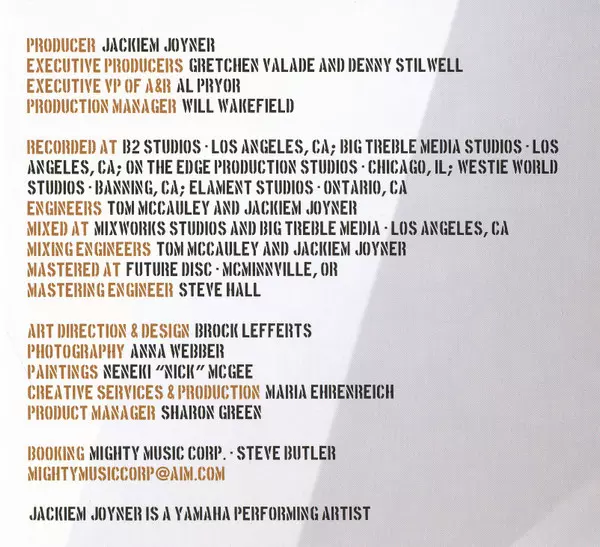 Bass Darryl Williams (12) | Drums Raymond Johnson (8) | Electric Guitar Kyle Bolden | Saxophone [Ensemble], Alto Saxophone [lead], Keyboards, Arranged By [String], Percussion Jackiem Joyner | Synth [Keys] Carnell Harrell (2) | Trombone Nikolai Egorov | Written-By Jackiem Joyner