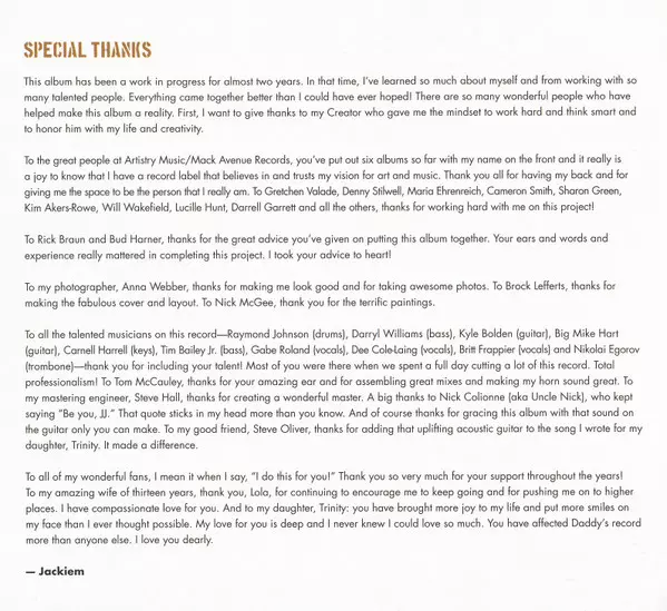 Acoustic Guitar [Lead] Steve Oliver (4) | Acoustic Guitar [Strum] Kyle Bolden | Alto Saxophone [Lead], Arranged By [String] Jackiem Joyner | Bass Darryl Williams (12) | Drums Raymond Johnson (8) | Piano Carnell Harrell (2) | Written-By Jackiem Joyner