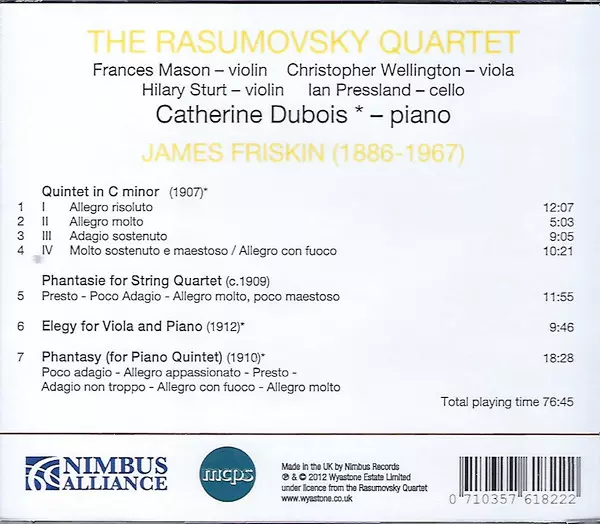 Titel | James Friskin - The Rasumovsky Quartet, Catherine Dubois, Piano |