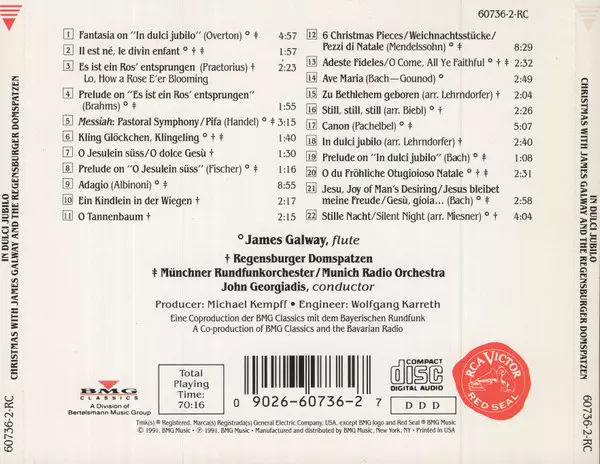 James Galway: In Dulci Jubilo Christmas With James Galway And The Regensburger Domspatzen versie op CD in standaard editie. Deze specifieke uitgave werd uitgebracht in VS bij uitgeverij RCA Victor Red Seal op 2. augustus 2007. Album valt binnen het genre Klassieke muziek, Folk, World, & Country, Barokmuziek, Modernism en Holiday.