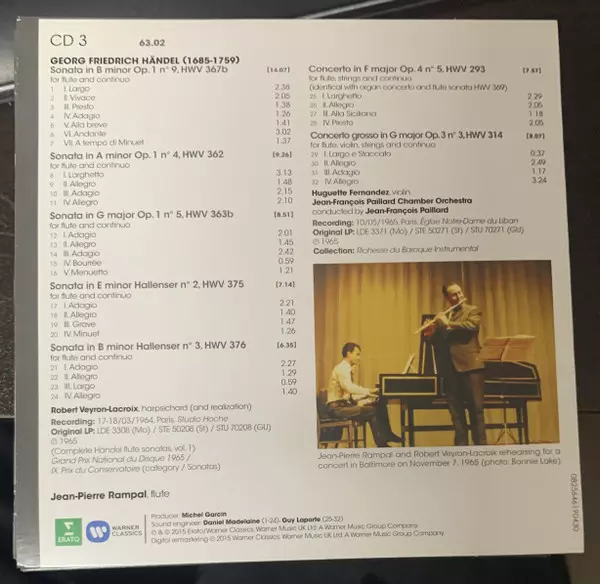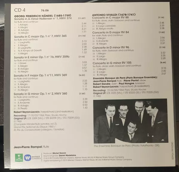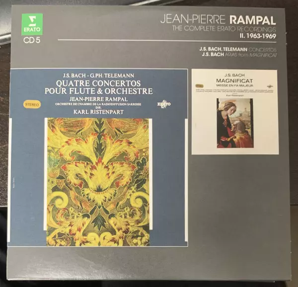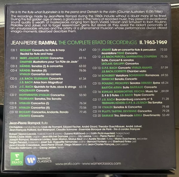 Jean-Pierre Rampal: The Complete Erato Recordings II. 1963-1969 versie op 20CD/Doos in standaard editie. Deze specifieke uitgave werd uitgebracht bij uitgeverij Erato op 24. april 2015. Album valt binnen het genre Klassieke muziek, Barokmuziek en Impressionistic. 1963 1969.