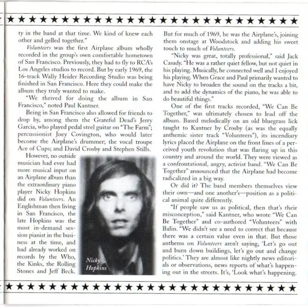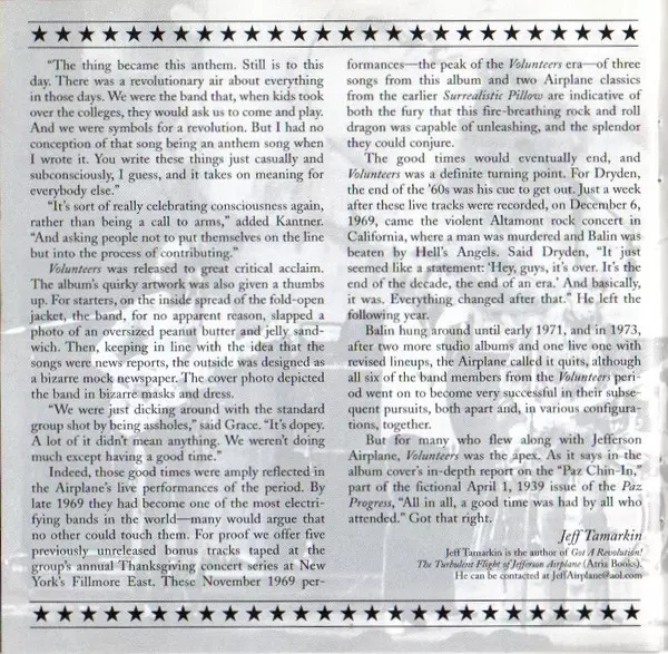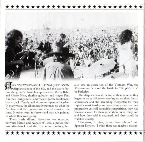 Rockoví veteráni z Jefferson Airplane na své šesté LP desce z roku 1969 opět potěšili posluchače vynikajícími písněmi, které si sami napsali. Nejlepší skladby: "We Can Be Together" a podmanivá titulní "Volunteers". Vynikající je také coververze evergreenu Crosbyho, Stilla & Nashe "Wooden Ships".