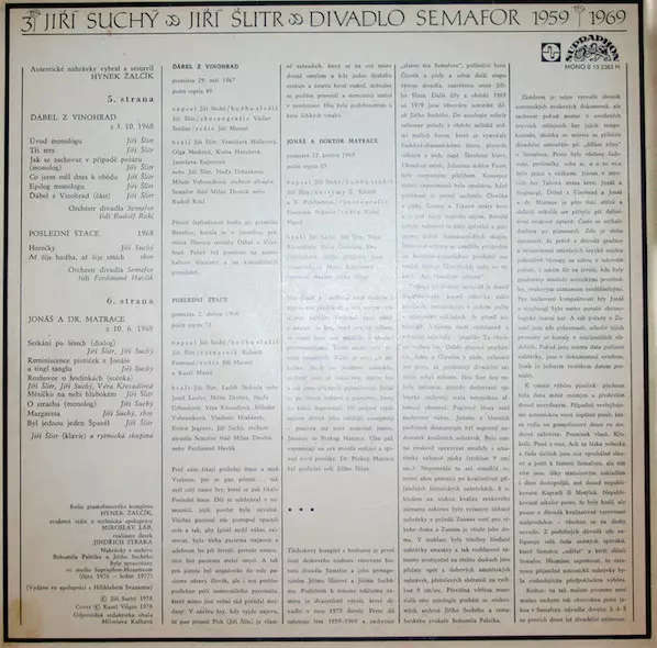 Jiří Suchý & Jiří Šlitr: Divadlo Semafor 1959 - 1969 (1-3) versie op vinyl 3LP in standaard editie. Deze specifieke uitgave werd uitgebracht in Tsjechoslowakije bij uitgeverij Supraphon in het jaar 1978. Album valt binnen het genre Pop, Non-Music, Gesproken woord, Chanson en Tsjecho-Slowaakse klassiekers.