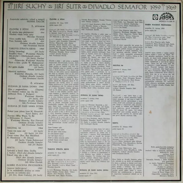Leader [Řídí] Ferdinand Havlík | Orchestra Orchestr Divadla Semafor | Vocals Jiří Suchý, Waldemar Matuška
