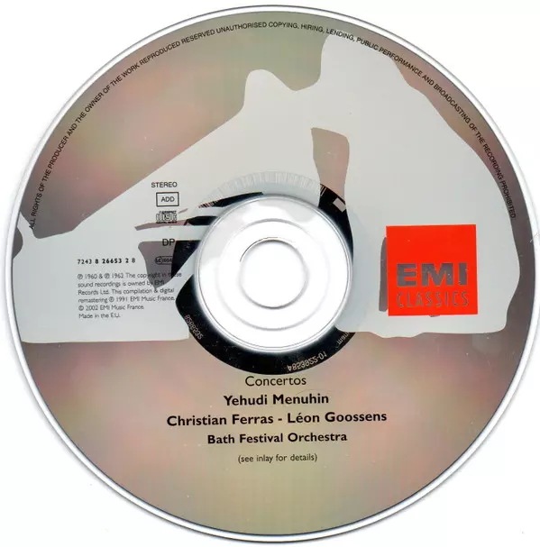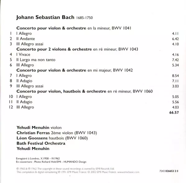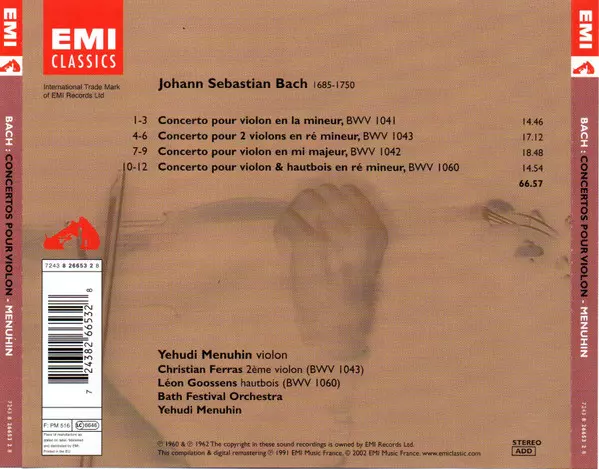 | Artiest | Johann Sebastian Bach | Yehudi Menuhin | Christian Ferras | Bath Festival Chamber Orchestra | Robert Masters Chamber Orchestra |
