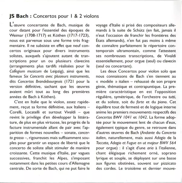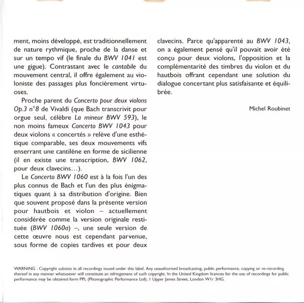 | Concerto Pour Violon, Hautbois Et Orchestre En Ré Mineur, BWV 1060 |