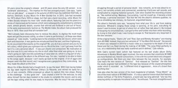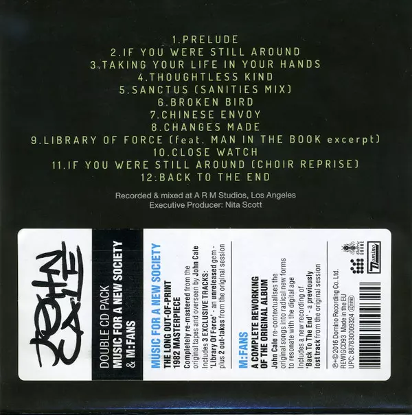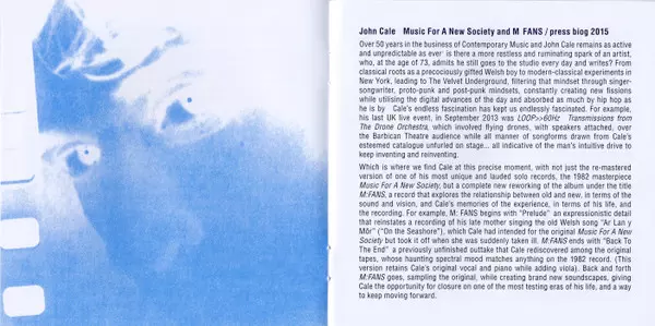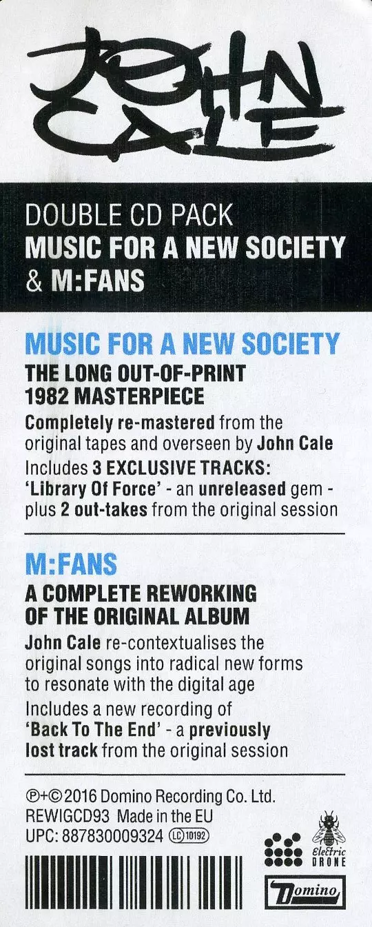 John Cale: Music For A New Society / M:FANS versie op 2CD in remastered editie. Deze specifieke uitgave werd uitgebracht in Europa en VK bij uitgeverij Domino in samenwerking met Electric Drone op 5. februari 2016. Album valt binnen het genre Rock, New Wave en Art Rock.