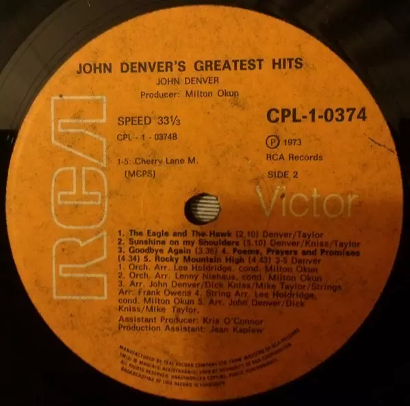 John Denver: John Denver's Greatest Hits versie op vinyl LP in standaard editie. Deze specifieke uitgave werd uitgebracht in Zuid-Afrika bij uitgeverij RCA in samenwerking met RCA Victor in het jaar 1973.
