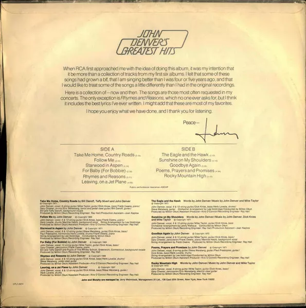 Arranged By [Strings] Lee Holdridge | Bass Dick Kniss | Conductor Milton Okun | Drums Herbie Lovelle | Guitar Steve Weisberg | Harmonica Paul Prestopino | Piano Frank Owens | Vocals, Guitar [6-String], Twelve-String Guitar John Denver | Written-By John Denver