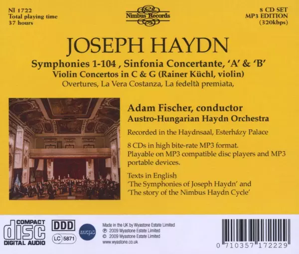 Joseph Haydn: The Complete Symphonies - The Esterházy Recordings versie op 8CD in standaard editie. Deze specifieke uitgave werd uitgebracht in Verenigd Koninkrijk bij uitgeverij Nimbus Records op 1. mei 2014. Album kan worden geclassificeerd als genre Klassieke muziek. 8 CD's 423 320kbps Mp3 + 1 X 23 Page Pdf.