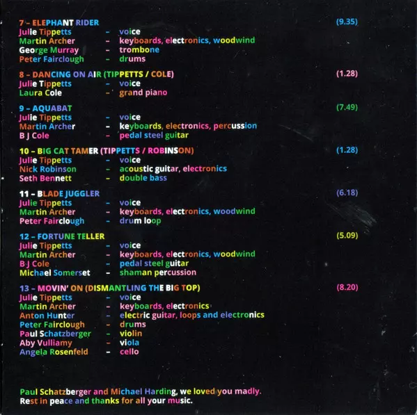 Cello Angela Rosenfeld | Electric Guitar Nick Robinson | Keyboards, Electronics, Woodwind Martin Archer | Pedal Steel Guitar BJ Cole | Viola Aby Vulliamy | Violin Paul Schatzberger | Voice Julie Tippetts