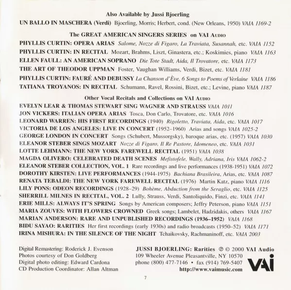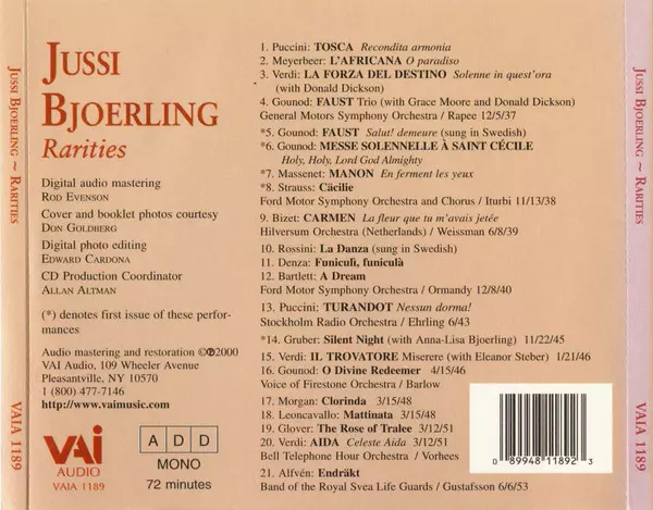 Jussi Björling: Rarities versie op CD in standaard editie. Deze specifieke uitgave werd uitgebracht in VS bij uitgeverij VAI Audio op 6. juni 2000. Album valt binnen het genre Klassieke muziek, Romance, Opera, Art Song en Lied.