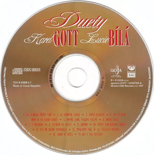 Karel Gott: Duety CLR versie op CD in gekleurde editie. Deze specifieke uitgave werd uitgebracht in Tsjechië bij uitgeverij Goja in samenwerking met Monitor-EMI.