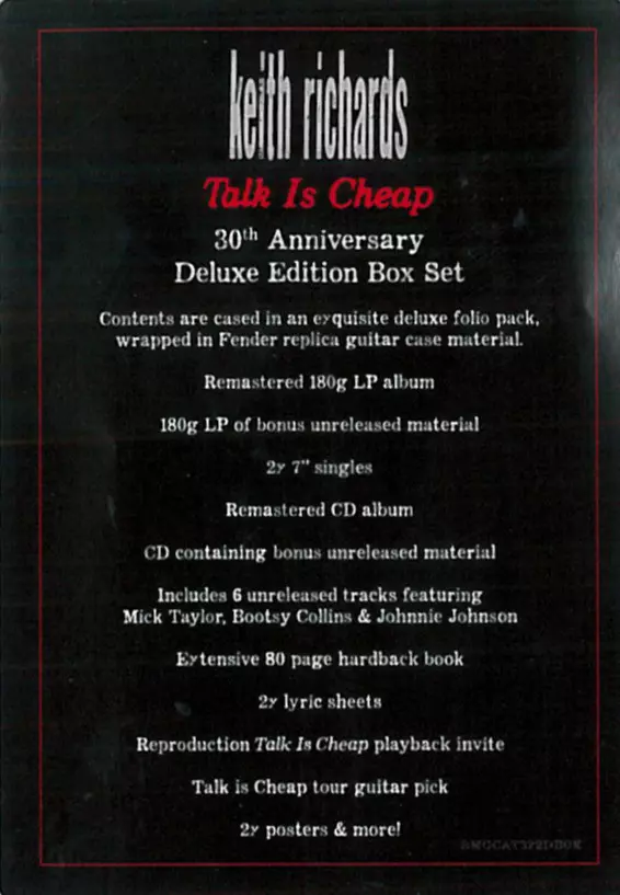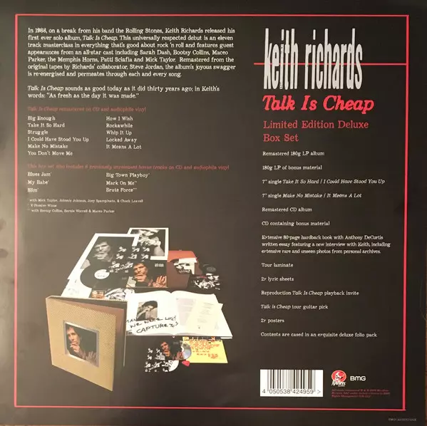 Keith Richards: Talk Is Cheap (30th Anniversary Deluxe Edition Box Set) DLX | LTD versie op vinyl 2LP/2CD/2SP/Doos in deluxe remastered 45 RPM limited editie. Deze specifieke uitgave werd uitgebracht in Europa, VK en VS bij uitgeverij Mindless Records (3) in samenwerking met BMG op 29. maart 2019.