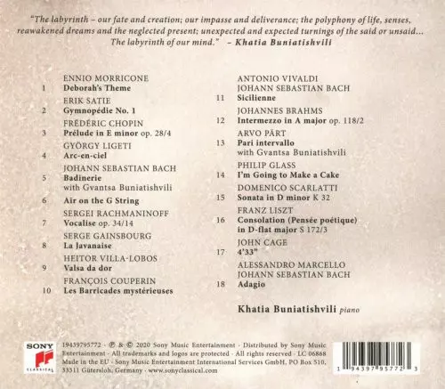 Khatia Buniatishvili's new recording for Sony Classical is as imaginative, sensitive and philosophical as the award-winning pianist herself. The concept album "Labyrinth" explores the immeasurable quest that is human life. Like a film, it follows the evolution of procrastination, melancholy, sensuality, joy and suffering - all from the perspecti...