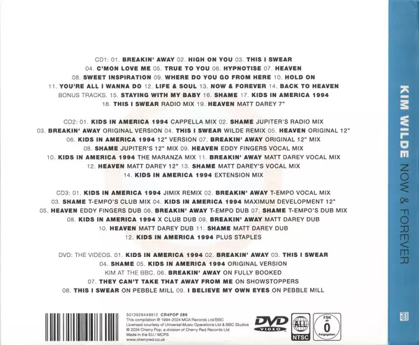 Kim Wilde: Now & Forever DLX versie op 3CD/DVD in deluxe editie. Deze specifieke uitgave werd uitgebracht in Europa bij uitgeverij Cherry Pop op 4. oktober 2024. Album valt binnen het genre Elektronische muziek, House en Synth-Pop. Region Free Expanded Deluxe 4 Disc Set Edition.