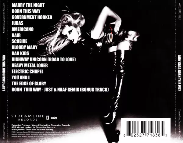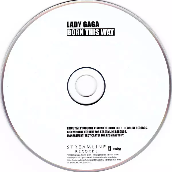 Lady Gaga: Born This Way versie op CD in standaard editie. Deze specifieke uitgave werd uitgebracht in Europa bij uitgeverij Streamline Records in samenwerking met Interscope Records en KonLive Distribution op 24. mei 2011.