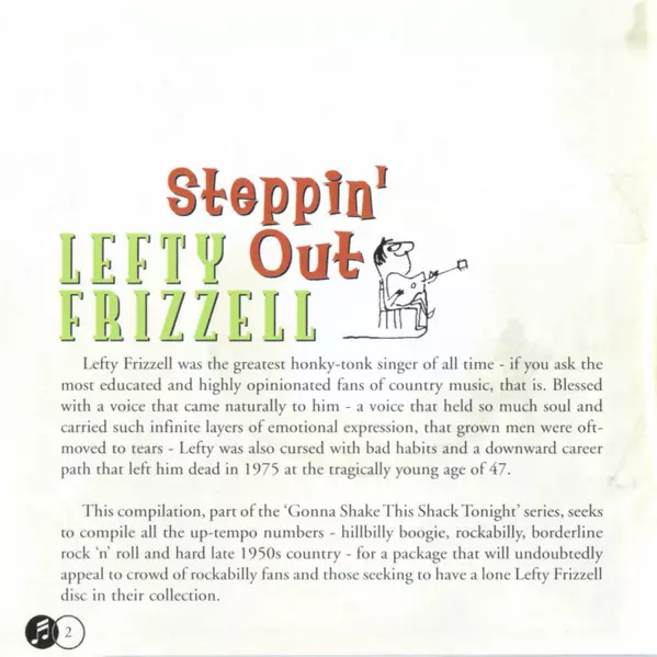 Lefty Frizzell: Steppin' Out versie op CD in standaard editie. Deze specifieke uitgave werd uitgebracht in Duitsland bij uitgeverij Bear Family Records op 5. augustus 2008. Album valt binnen het genre Folk, World, & Country, Country en Honky Tonk.