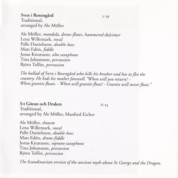 Alto Saxophone Jonas Knutsson | Arranged By Ale Möller | Composed By Traditional | Double Bass Palle Danielsson | Fiddle Mats Edén | Mandola, Flute [Drone-Flutes], Hammered Dulcimer Ale Möller | Percussion Björn Tollin, Tina Johansson | Vocals Lena Willemark