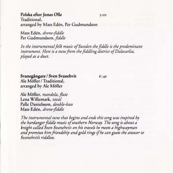 Arranged By Ale Möller | Composed By Traditional | Double Bass Palle Danielsson | Fiddle [Drone-Fiddle], Kantele Mats Edén | Mandola Ale Möller | Percussion Björn Tollin, Tina Johansson | Soprano Saxophone Jonas Knutsson | Vocals Lena Willemark