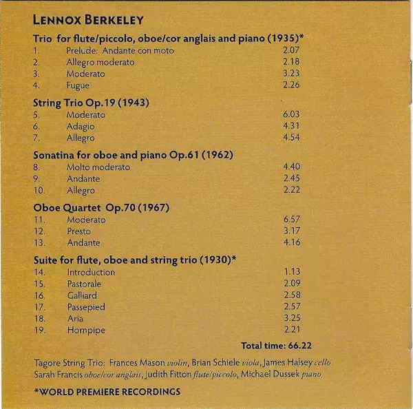 | Artiest | Lennox Berkeley | Michael Dussek | Sarah Francis | Judith Fitton | Tagore String Trio |