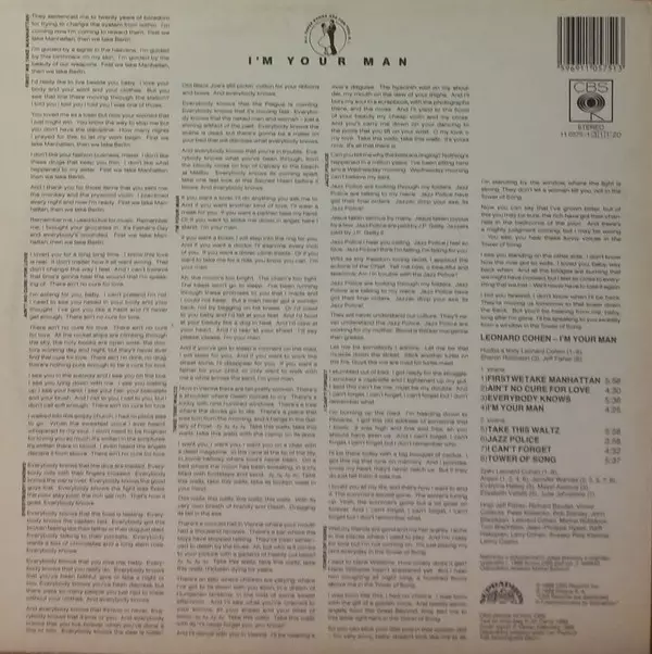 I'm Your Man is the eleventh studio album by Leonard Cohen , released on January 20, 1988. The album was a critical and commercial success and was the first Cohen album to top the Billboard charts in the United States. The album I'm Your Man features Cohen's backing band The Webb Sisters and features guest appearances by The Neville Brothers and...