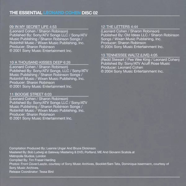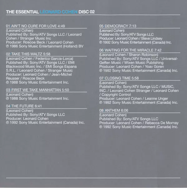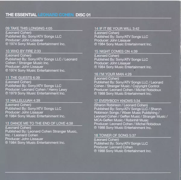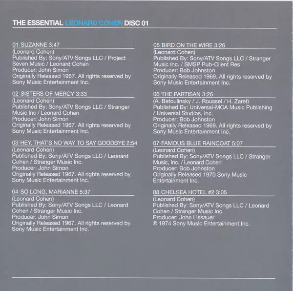 The Essential Leonard Cohen is a compilation album released in 2002 by Leonard Cohen.The album is a retrospective of Cohen's career and features songs from his first album, Songs of Leonard Cohen (1967), to his most recent album, Ten New Songs (2001). The album was produced by Cohen's longtime collaborator Bob Johnston. The Essential Leonard Coh...
