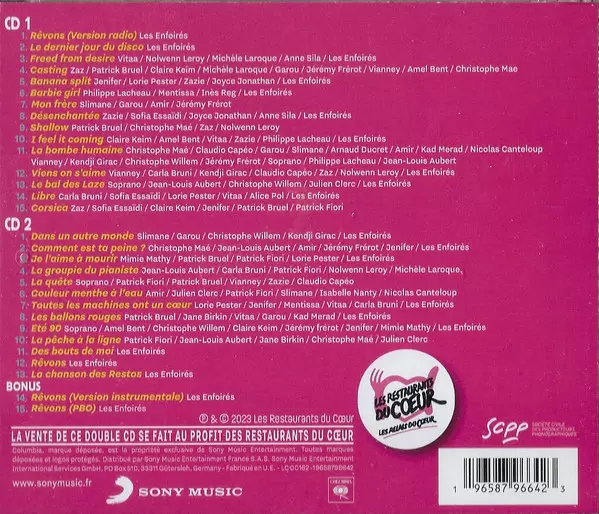 Les Enfoirés: 2023 Enfoirés Un Jour, Toujours versie op 2CD in standaard editie. Deze specifieke uitgave werd uitgebracht in Frankrijk bij uitgeverij Sony Music in samenwerking met Columbia op 4. maart 2023. Album kan worden geclassificeerd als genre Pop.