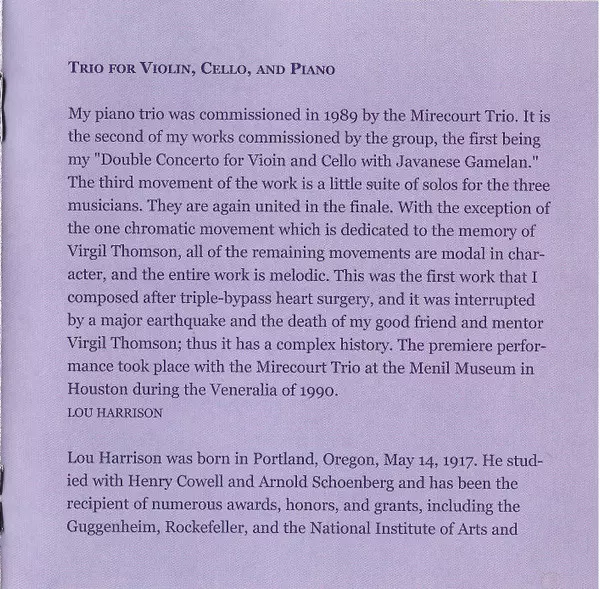 | Artiest | Lou Harrison | The Mirecourt Trio |