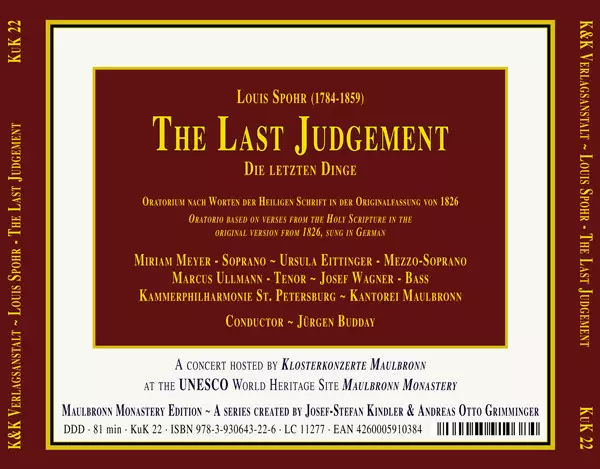 Louis Spohr: Die Letzten Dinge / The Last Judgement versie op CD in standaard editie. Deze specifieke uitgave werd uitgebracht in Duitsland bij uitgeverij K&K Verlagsanstalt op 22. december 2010. Album valt binnen het genre Klassieke muziek, Romance en Opera. "apocalypse".