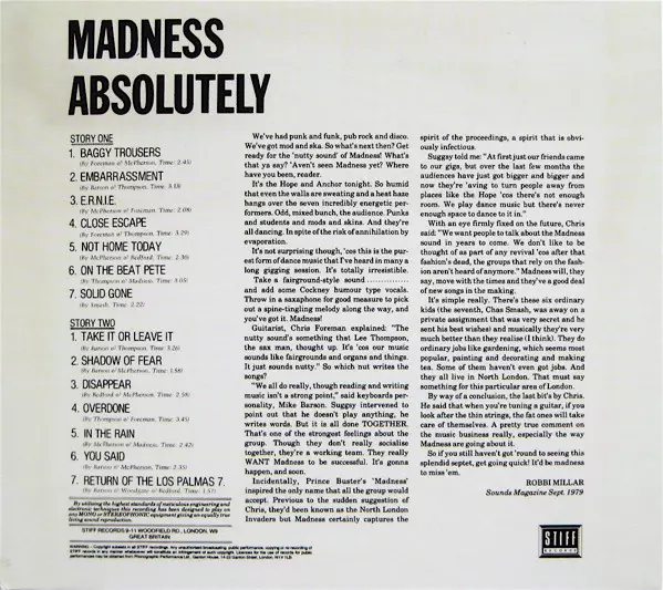 Absolutely is the third studio album by the British ska band Madness.It was released on 14 February 1980 on Stiff Records. The album reached number two in the UK Albums Chart and was awarded a platinum record by the British Phonographic Industry for selling over 300,000 copies. The album Absolutely spawned four singles, "My Girl", "Baggy Trousers", "The Prince" and "House of Fun".