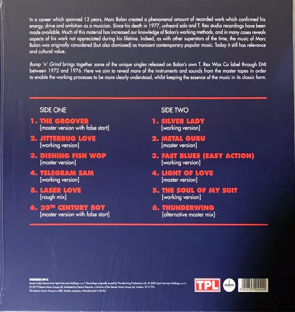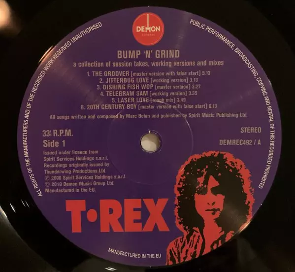 Marc Bolan: Bump 'n' Grind versie op vinyl LP in remastered editie. Deze specifieke uitgave werd uitgebracht in Europa bij uitgeverij Demon Records op 6. september 2019. Album valt binnen het genre Rock, Pop, Pop Rock en Glam. 180g Vinyl.