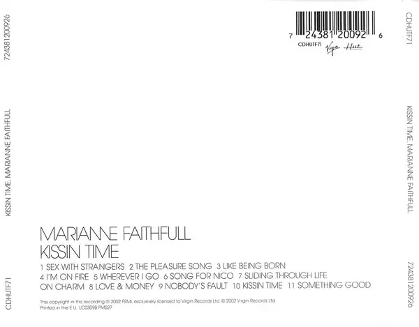 Marianne Faithfull: Kissin Time versie op CD in standaard editie. Deze specifieke uitgave werd uitgebracht in Europa bij uitgeverij Hut Recordings in samenwerking met Virgin op 13. augustus 2002. Album valt binnen het genre Rock, Elektronische muziek, Art Rock en Synth-Pop.
