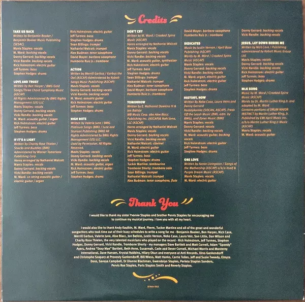 Arranged By [Horns Arranged By] Nate Walcott | Backing Vocals Donny Gerrard, Vicki Randle | Baritone Saxophone David Moyer | Bass Jeff Turmes | Drums Stephen Hodges | Electric Guitar Rick Holmstrom | Tenor Saxophone Alex Budman | Trombone Humberto Ruiz | Trumpet Nate Walcott, Sean Billings | Twelve-String Guitar [12-String Acoustic Guitar], Acoustic Guitar [12-String Acoustic Guitar], Electric Guitar, Organ M. Ward | Vocals Mavis Staples | Written-By Charity Thielen